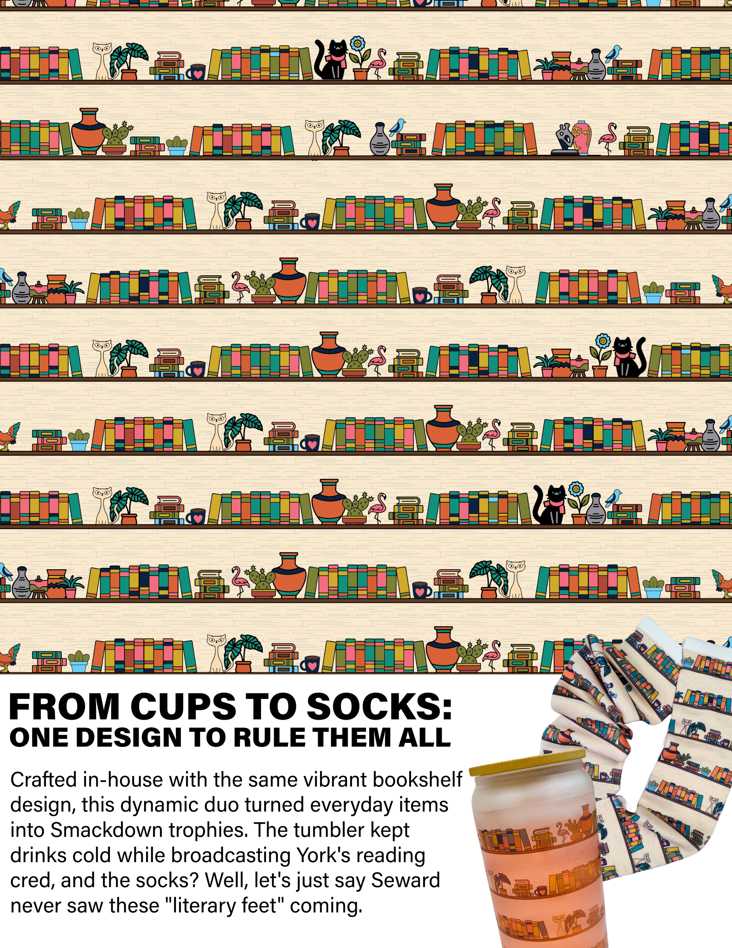 Makerspace-Crafted Swag: Designed and produced bookshelf-patterned tumblers/socks, Monopoly-money mugs, and more